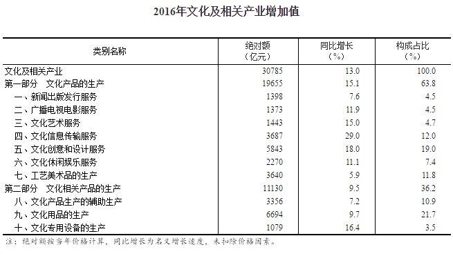 數(shù)據(jù)顯示,根據(jù)《文化及相關產(chǎn)業(yè)分類(2012)》和《文化及相關產(chǎn)業(yè)增加值核算方法》的規(guī)定和要求,經(jīng)核算,2016年全國文化及相關產(chǎn)業(yè)增加值為30785億元,比上年增長13.0%(未扣除價格因素,下同),比同期GDP名義增速高4.4個百分點;占GDP的比重為4.14%,比上年提高0.17個百分點。2016年文化及相關產(chǎn)業(yè)保持平穩(wěn)快速增長,比重穩(wěn)步上升,對促進經(jīng)濟轉(zhuǎn)型升級、平穩(wěn)健康可持續(xù)發(fā)展發(fā)揮了重要作用。