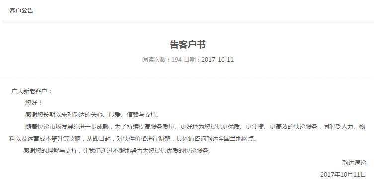10月11日,韻達快遞官網發布《告客戶書》,表示為提供更優質、更便捷、更高效的快遞服務,同時受人力、物料以及運營成本攀升等影響,從即日起,對快件價格進行調整,具體請咨詢韻達全國當地網點。