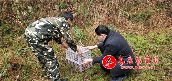 3月2日,喜河鎮長陽村支部書記江本忠和生態護林員李品府將一只鼬獾放歸大自然。