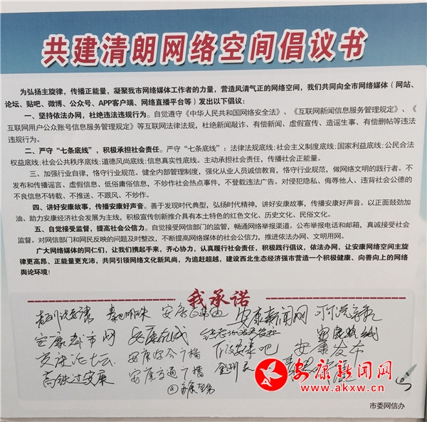 會議組織傳達學習了省市輿論環(huán)境集中整治專項行動工作會議精神;市公安局、市文廣局就網絡輿論環(huán)境整治工作做了匯報發(fā)言;與會人員共同發(fā)起并簽訂了《共建安康清朗網絡空間倡議書》;5家網絡媒體及平臺代表圍“繞弘揚主旋律、傳播正能量,營造清朗網絡空間”進行了表態(tài)發(fā)言。