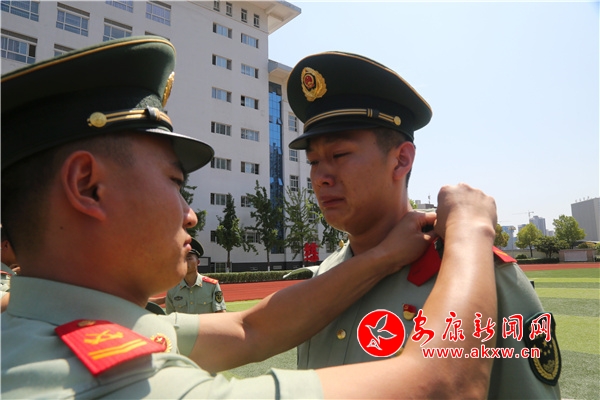 “我是中國人民武裝警察部隊軍人,我宣誓……”離隊前,武警安康支隊組織滿服役期士兵開展退役儀式。滿服役期老兵身披綬帶、胸戴紅花,最后一次站在軍旗前以軍人的身份,重溫誓詞、向軍旗敬禮。期間,留隊戰(zhàn)友為滿服役期士兵卸下警銜、領(lǐng)花、帽徽和胸標,為他們戴上“光榮花”。“8年了 ,突然要離開,還真有點舍不得。”卸下肩章的那一刻,下士趙毅璞眼中泛起的淚花忍了又忍,終究還是沒能忍住。