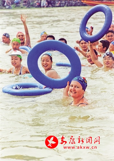 第一屆龍舟節的游泳隊中還有英國支教老師琳達的身影。吳永東 攝VEB安康新聞網