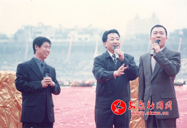 2002年,第三屆安康龍舟節上,姜昆、戴志誠、金維潤為觀眾帶來群口相聲《歡迎您到安康來》。 趙方 攝VEB安康新聞網