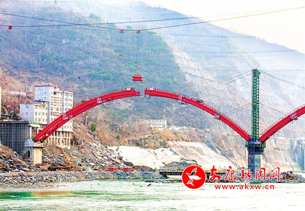 2月15日,元宵節里的旬陽蜀河漢江大橋建設工地一派繁忙景象,大橋建設者正抓緊施工確保如期通車。 郭圣杰 攝
