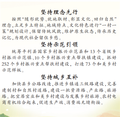 著力加強鄉(xiāng)村治理。抓好基層組織建設,以保障和改善民生為優(yōu)先方向,在“三治融合”模式上探索“五治體系”。健全縣鎮(zhèn)村三級治理體系,派強用好駐村第一書記和工作隊,促進重心下移和資源下沉。抓好載體機制建設,全域推廣“321”基層治理模式,實施村級事務“陽光工程”,編制村級“小微權力”等事項清單,落實“四議兩公開”制度,引導群眾參與鄉(xiāng)村建設和鄉(xiāng)村治理。抓好精神文明建設,持續(xù)推進移風易俗,大力弘揚孝義文化,培育文明鄉(xiāng)風、良好家風、淳樸民風。深入推進農村人居環(huán)境整治和村莊清潔專項行動,再啟動110個示范村創(chuàng)建。