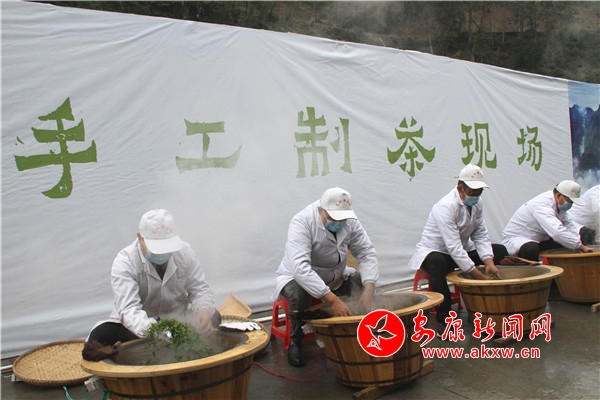 制茶人現(xiàn)場(chǎng)炒茶,介紹制茶的流程,突出嵐皋茶獨(dú)特制作工藝;茶藝師現(xiàn)場(chǎng)沖泡春茶,攤青、殺青、揉捻、做形、烘焙…新火試新茶,手工漸次綻現(xiàn),呈現(xiàn)千年古法傳承之景。