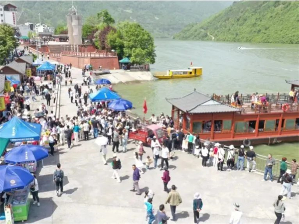 在后柳水鄉的碼頭邊,游船售票口人頭攢動,買完票的游客滿心期待著登船游覽漢江三峽的美景。