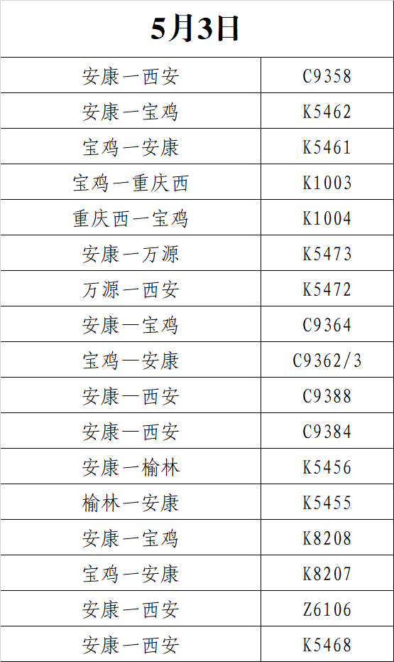 為滿足旅客返程需求,5月3日安康火車站共加開旅客列車21列。主要集中在西安、寶雞、榆林、重慶、萬源等方向。dGs安康新聞網