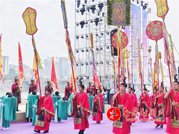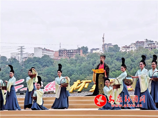悠悠古琴聲中,青衣女子們手提竹籃蹁躚而來(lái)。“緬懷先賢”,主祭官一聲令下,全場(chǎng)矚目中,9位大漢護(hù)送屈原像至舞臺(tái)中央,開幕式翻開祭祀篇章。主祭官走向高臺(tái)仰頸高呼:“詠?lái)灱牢?hellip;…”百名身著漢服、手持竹簡(jiǎn)的孩童齊聲詠?lái)灒D挫抑揚(yáng),激蕩云霄。“萬(wàn)民歡慶歌盛世,安瀾裕阜唱安康。”典禮儀成,青衣女子們“兵分兩列”,一列把竹籃里面的粽子拋向江中,追念先賢,一列繞場(chǎng)為現(xiàn)場(chǎng)觀眾贈(zèng)發(fā)香包,送上幸福安康的祝福。