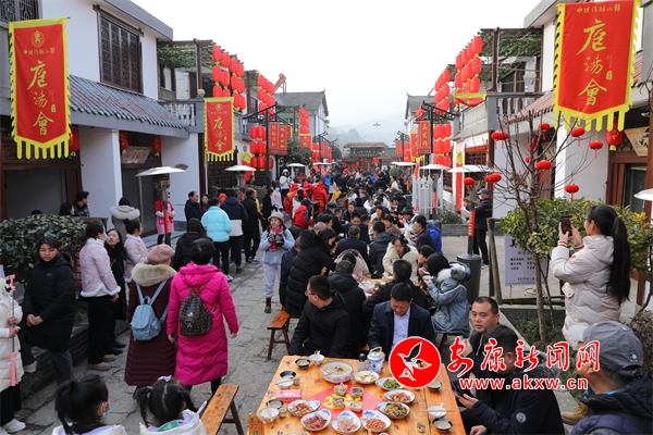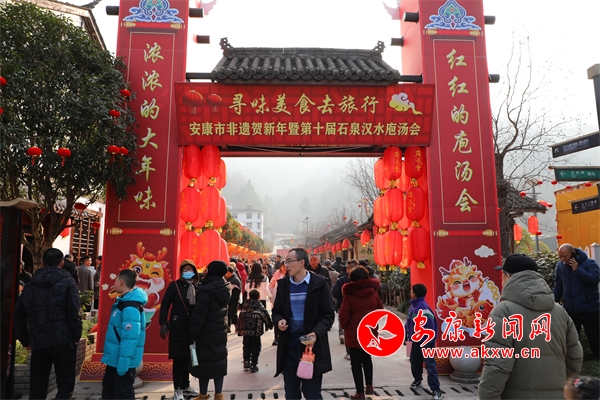 走進石泉縣中壩作坊小鎮,大紅燈籠高高掛,山貨特產來云集,洋溢著喜慶的過年氛圍。隨著打連錢、舞彩獅、抬花轎、采蓮船等民俗展演活動開始,中壩文化休閑廣場上人山人海,熱鬧非凡。陜北民歌手、安康小場子、漢調二黃等非遺傳承“文化走親”活動,更是給廣大游客和城鄉群眾帶來豐富多彩的文化體驗。“上菜嘍——”隨著一聲長長的吆喝聲,最具年俗特色的庖湯宴開始了,方桌板凳擺長街,用剛剛宰殺的新鮮豬肉烹飪出的各色陜南傳統美食,吸引了眾多鄉親和游客來品嘗。