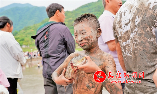 圖一:平利縣廣佛鎮第三屆插秧節上,游客和村民一起體驗抓魚。王韜 攝RSx安康新聞網