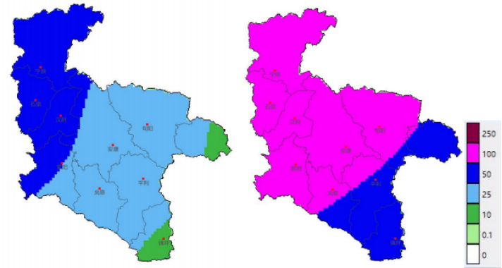 圖左為:7月5日00時—6日00時降水量預報圖  圖右為:7月5日00時—11日00時累計雨量預報圖3eC安康新聞網