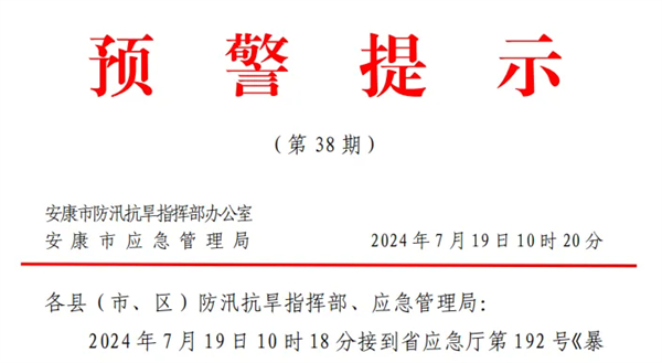2024年7月19日10時18分接到省應急廳第192號《暴雨橙色預警》:預計未來3小時我市漢濱區、寧陜縣降雨量將達50 毫米以上,未來6小時我市漢陰縣、石泉縣、旬陽市、白河縣將達50毫米以上,以上地區境內發生山洪、泥石流等災害風險較高。