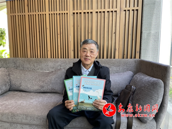 在瀛湖翠屏島上,采訪團(tuán)采訪了退休教師林俊禮。林俊禮今年70歲。他從2015年開(kāi)始用相機(jī)記錄調(diào)查漢江陜西段動(dòng)植物,依據(jù)一手資料編寫了國(guó)家南水中線水源地生態(tài)科普三部曲《神奇的水鳥(niǎo)》《可愛(ài)的魚(yú)類》《多彩的水生植物》,來(lái)宣傳漢江陜西段美好生態(tài)資源。
