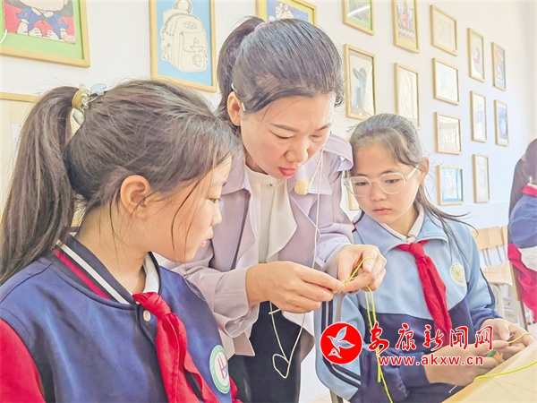 倉(cāng)上鎮(zhèn)中心小學(xué)編織社團(tuán)老師在教授編織技巧
