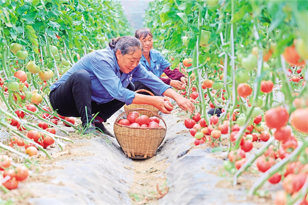 農(nóng)民在秦葉情現(xiàn)代農(nóng)業(yè)園區(qū)采摘西紅柿