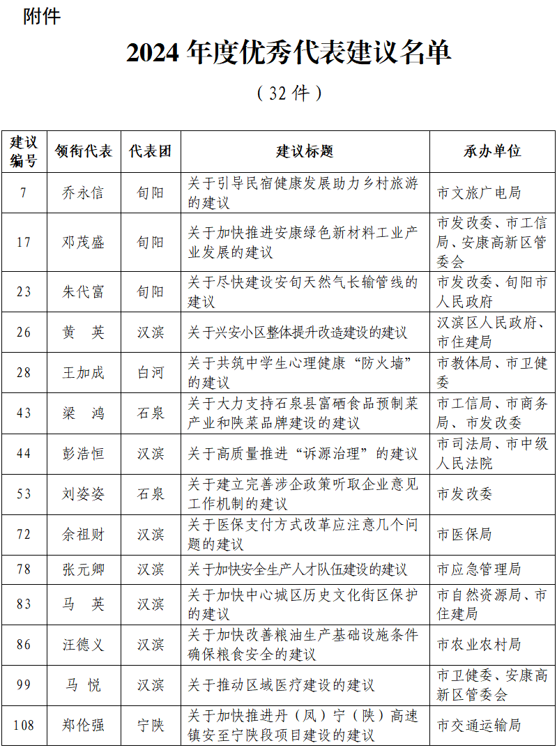 市五屆人大五次會議以來,全體市人大代表緊緊圍繞全市中心工作和人民群眾普遍關(guān)心關(guān)注的熱點難點問題,依法履行職責(zé),積極建言獻(xiàn)策,共提出了256件代表建議,這些建議主題明確具體、建議切實可行、行文簡潔規(guī)范、效果可期可見,為推進(jìn)我市經(jīng)濟(jì)社會發(fā)展和民主法治建設(shè)凝聚了智慧、增進(jìn)了共識、貢獻(xiàn)了力量。為樹立典型、推進(jìn)工作,市人大常委會決定,對喬永信等代表提出的32件優(yōu)秀代表建議予以通報表揚(yáng)。
