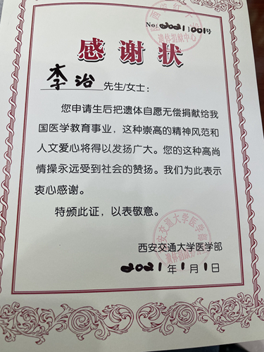 15年來,李治還積極資助困難學(xué)生、為災(zāi)區(qū)捐資捐物,為他人、為社會付出了很多,但他總覺得不夠。2021年,他自愿申請并成功登記為遺體捐獻(xiàn)志愿者。“這是我那年送給自己的新年禮物。”他指著西安交通大學(xué)醫(yī)學(xué)部的感謝狀說。