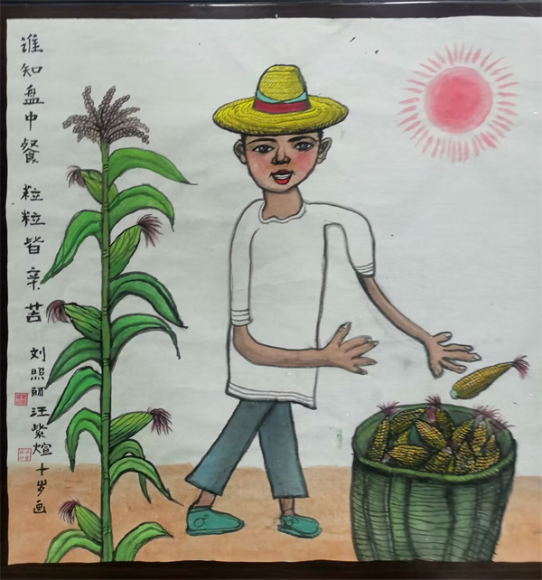 四年級的汪紫煊在參加夏令營時,在玉米田里看到一幕,深深地吸引了她,一位農(nóng)民伯伯戴著草帽在烈日下,把玉米裝進筐里。曾經(jīng)學過的詩句在她腦海里浮現(xiàn),文字變成了立體的畫面,她為自己這幅畫起名《誰知盤中餐 粒粒皆辛苦》。汪紫煊覺得,這種吃苦耐勞的精神要發(fā)揚,更要珍惜糧食,感受糧食的來之不易。