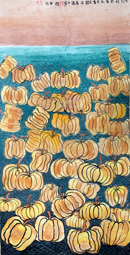 畫面上緊密排列的南瓜,給人一種飽滿、充實的視覺感受,顯示了收獲的豐盛,也表達出一種對富足生活的滿足和喜悅之情。汪佳涵選擇了家鄉(xiāng)常見的農(nóng)作物作為自己的繪畫主題,直白地表達了對家鄉(xiāng)的認可和贊美,展示了她對家鄉(xiāng)生活的認同和熱愛。