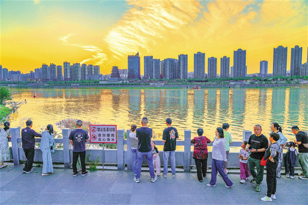 5月2日,天邊的云彩被夕陽染成了暖黃色,與江水的波光相互輝映,構成了一幅絕美的畫卷。圖為安康城區濱江公園的步道上,眾多游客在享受愜意的時光。皮勇維 攝