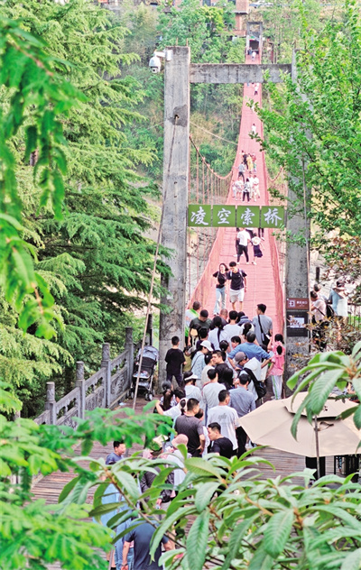 好山好水迎客來。5月3日,各地游客在紫陽縣陜甘茶馬古道景區打卡游玩。圖為游客在服務人員的引導下有序排隊,依次踏上景區內的凌空索橋。儲茂銀 攝