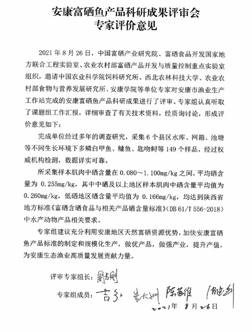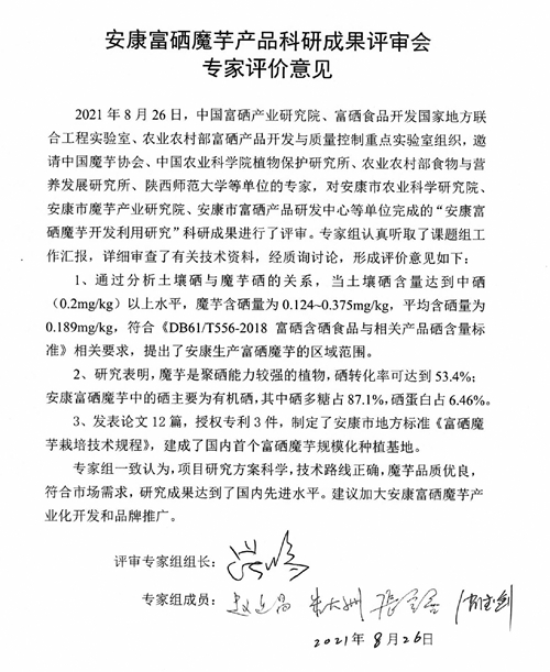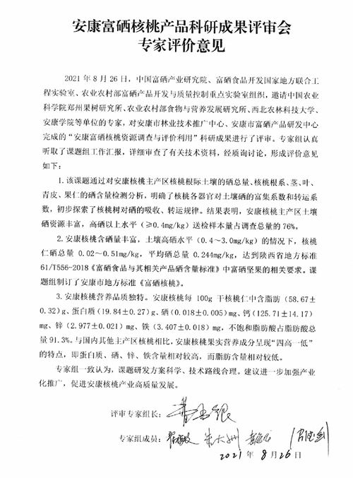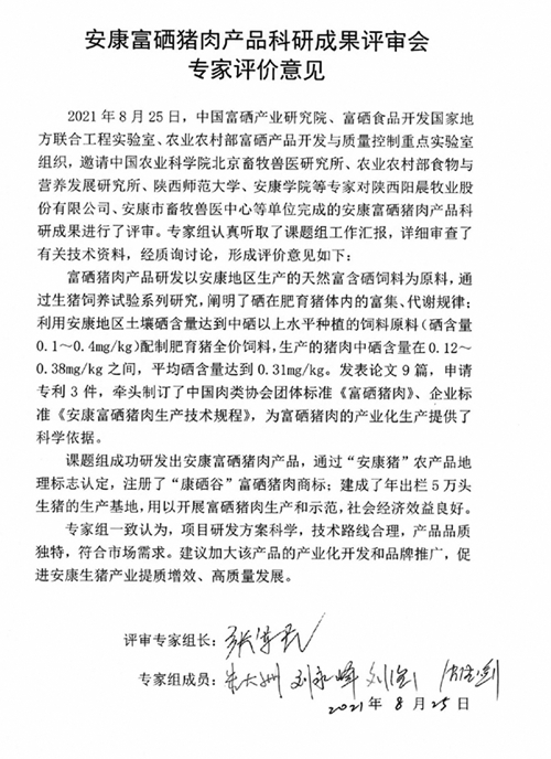 本次評審中,專家組認真聽取了課題組工作匯報,詳細審查了有關技術資料,經質詢討論后一致認為:四大富硒特色產業課題研發方案科學、技術路線合理,研究成果達到國內先進水平,天然富硒是安康得天獨厚的資源優勢,培育開發出的產品品質優良,符合市場需求。建議充分利用安康地區天然富硒資源優勢,加快富硒特色產業標準的制定和規模化生產,做優產品、做強產業、提升產值,加大該產品的產業化開發和品牌推廣力度,促進產業提質增效。Msg安康新聞網