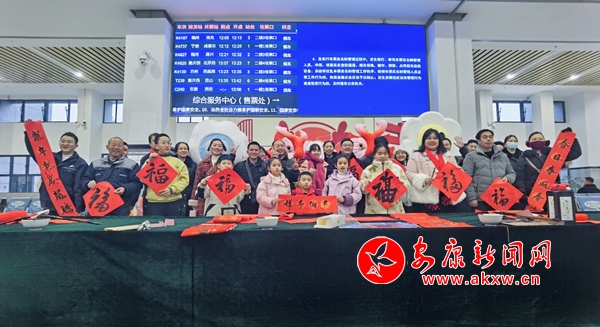 活動另一邊,7名來自安康地區(qū)的鐵路書法家們在候車室內(nèi)揮毫潑墨,一氣呵成,將一副副飽含著美好祝愿的春聯(lián)和一張張洋溢著節(jié)日喜慶的“福”字送到旅客手中,讓旅客的春運旅途充滿濃濃“年味”。
