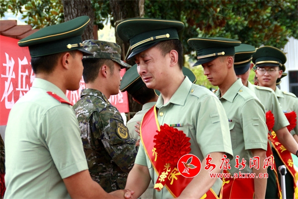 一雙雙緊握的手、一個個深情的擁抱,伴隨著悠揚的音樂,在送行的人群中我們看到了戰友們緊緊相擁,你一言、我一語,無一不訴說著戰友之間無限的眷戀?粗磳⒎謩e的戰友,官兵們再也控制不住內心的情感,眼中的淚水如斷線的珠子不斷滑落。這不僅是對軍營生活的留念,更是對軍旅青春的不舍。
