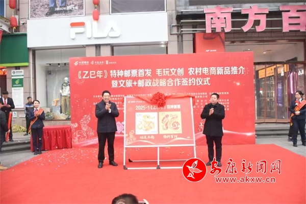本網訊(通訊員 沈巧苗)龍騰辭舊歲,巳蛇報春來,1月5日上午9點,《乙巳年》特種郵票首發、生肖毛玩文創、農村電商新品推介暨文旅+郵政戰略合作簽約活動舉辦,現場參加活動人達300余人。