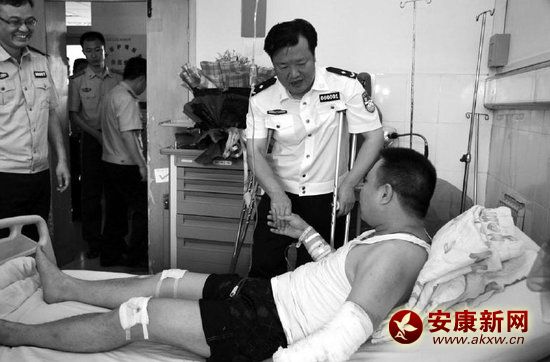 安康市公安局局長看望王曉勇 本報記者吳琛攝 “為抓捕犯罪嫌疑人,他被拖行100余米,全身多處擦傷,警察兄弟辛苦了!”、“用你的傷痛,換來……