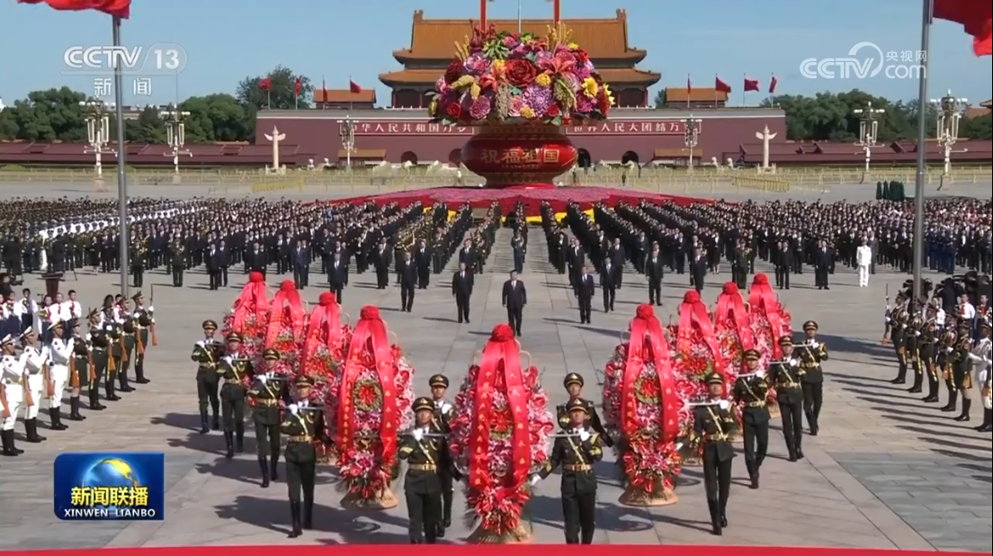 方陣前,以中共中央,全國人大常委會,國務(wù)院,全國政協(xié),中央軍委,各民主黨派、全國工商聯(lián)和無黨派愛國人士,各人民團體和各界群眾,老戰(zhàn)士、老同志和烈士親屬,中國少年先鋒隊名義敬獻的9個大型花籃一字排開,花籃紅色緞帶上書寫的“人民英雄永垂不朽”格外醒目。