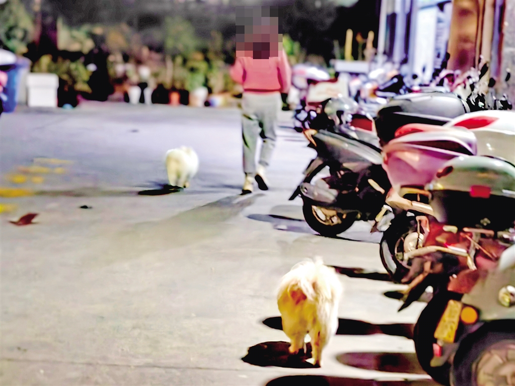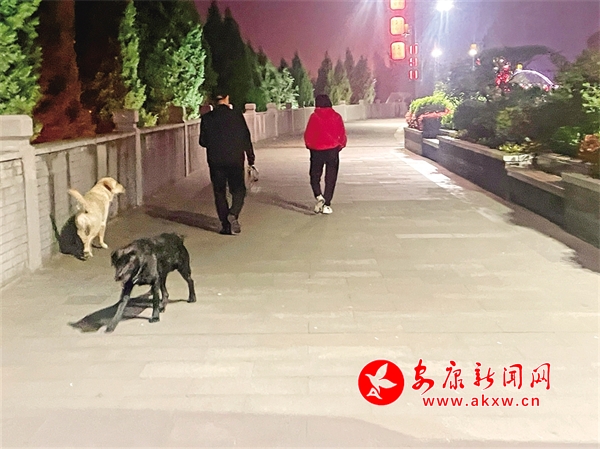 4月5日晚,安康城區城堤上有市民遛狗不牽繩。胡波 攝……