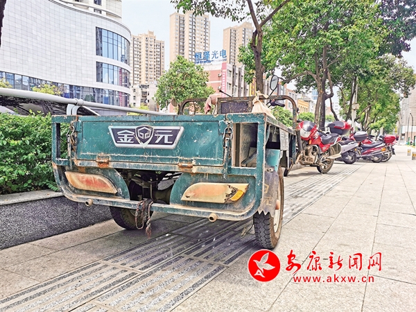 6月22日,安康城區江北江華公司消防通道被摩托車占用(圖1),這一區域的人行道盲道也被各種車輛侵占(圖2),存在安全隱患。(記者 潘潤生 攝)