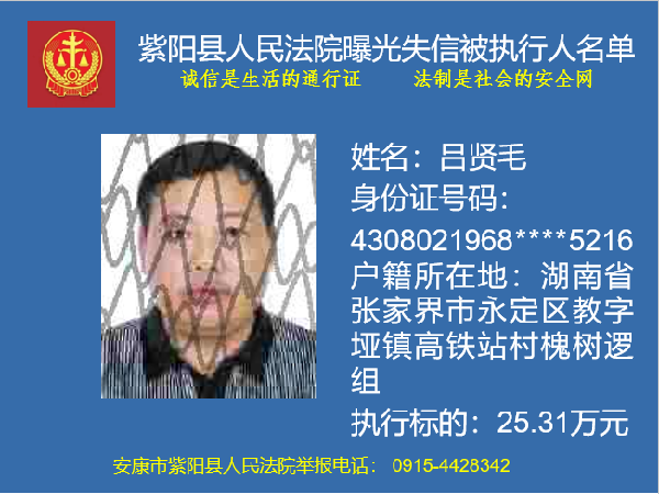 被執行人呂賢毛,你因不履行(2017)陜0924民初241號民事判決書確定的義務,已被紫陽縣人民法院納入失信被執行人名單庫依法進行信用懲戒。信用懲戒范圍包括但不限于以下措施: