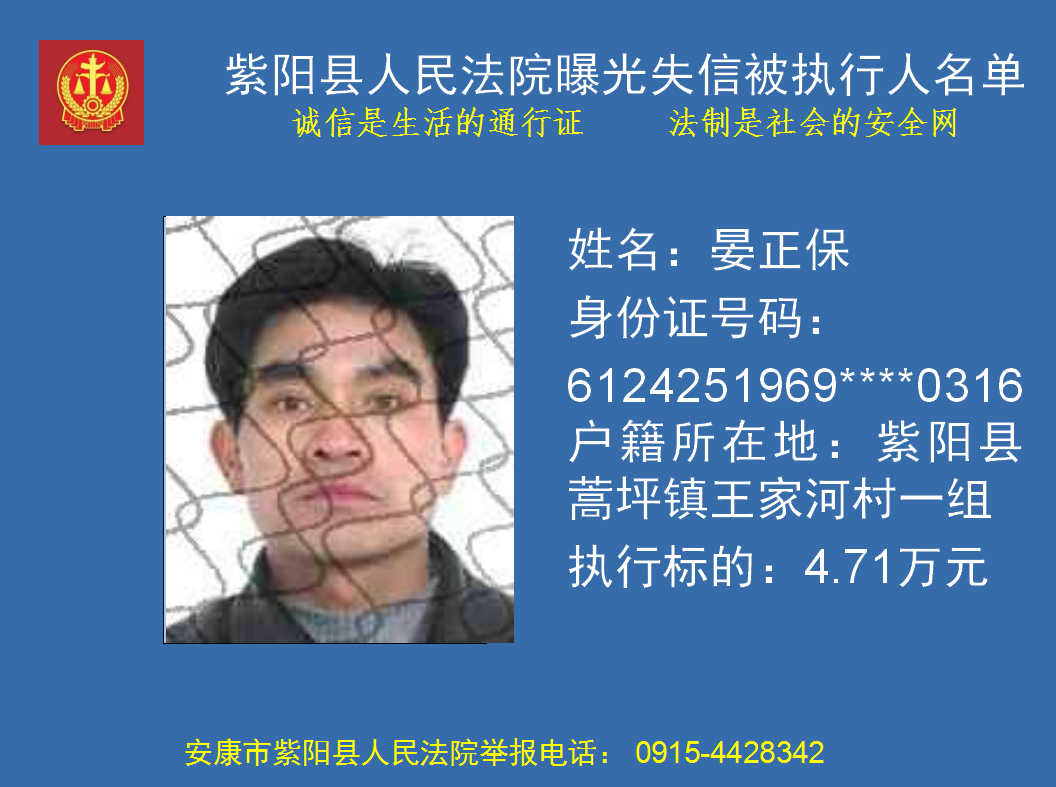 被執行人晏正保,你因不履行(2017)陜0924民初241號民事判決書確定的義務,已被紫陽縣人民法院納入失信被執行人名單庫依法進行信用懲戒。信用懲戒范圍包括但不限于以下措施: