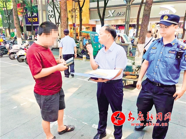 7月18日上午,漢濱城管執法分局“‘痰’吐文雅,舉‘紙’得體”糾治組在金州路、白天鵝廣場以及公交車站附近巡查值守,對取證發現的隨地吐痰不文明行為進行法規宣傳教育,并采取罰款、微信朋友圈發公益廣告集贊等形式給予糾治。李東 攝QNs安康新聞網