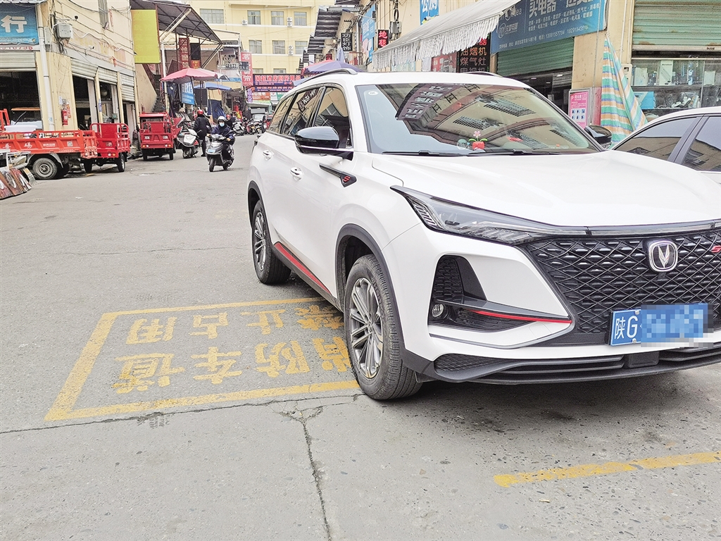 三橋批發市場內,一輛白色小轎車停放在消防車道標識之上