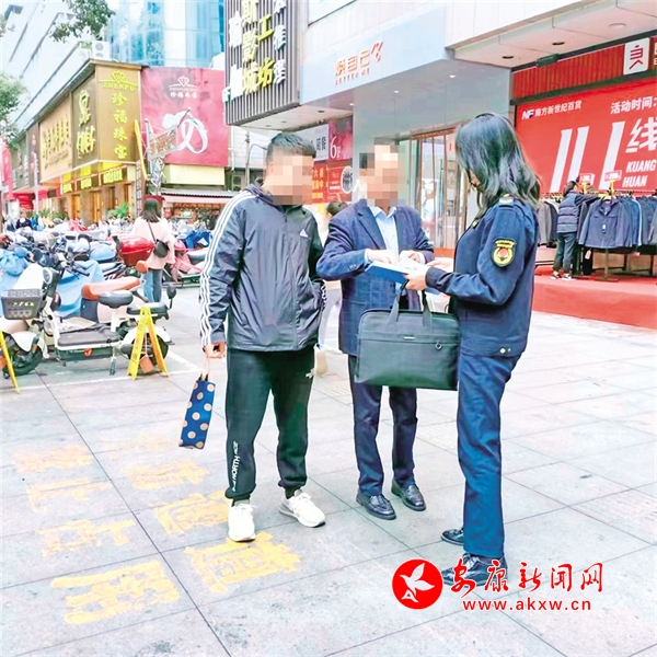 11月6日,漢濱區城管執法人員在金州路開展糾治隨地吐痰專項執法,對隨地吐痰人員提示改正,并根據相關規定進行處罰。市創文辦供圖……