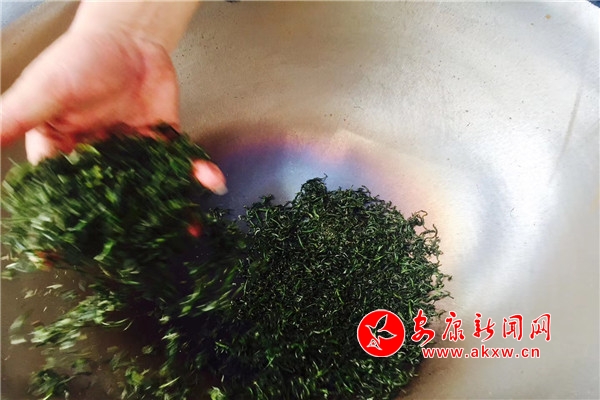 活動現場,三口電炒鍋一字排開,三位炒茶師傅雙手翻飛,嫩綠的鮮葉在他們手中滾動擠壓,揉捻、殺青、焙烘......最終成為我們常見的毛尖茶葉。