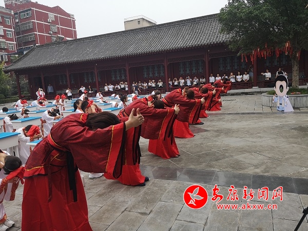 據了解,“開筆禮”是中國古代人生“四大禮”之首,是蒙童入學階段極為重要的儀式。“開筆禮”儀式主要分成六項內容,每一項內容承載著特定的教育目的。“正衣冠”要求學子們養成干凈整潔的生活習慣;“感恩鞠躬”讓學子向師長行揖禮,謝師恩、謝親恩,并為師者和長輩奉茶,讓他們從小懂得孝親尊師的道理;“凈手凈心”讓學子們從此靜心讀書,心無旁騖;“朱砂啟智”,表達了師長對學子們的美好祝愿,希望他們心明眼亮,聰慧過人;“擊鼓明志”讓學子們樹立遠大的理想與目標;“開筆啟蒙”書寫“人”字,學會做人的道理。蒙童通過親身經歷這種莊嚴古樸的儀式,實現從蒙童到學生的心理過渡。