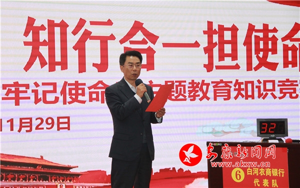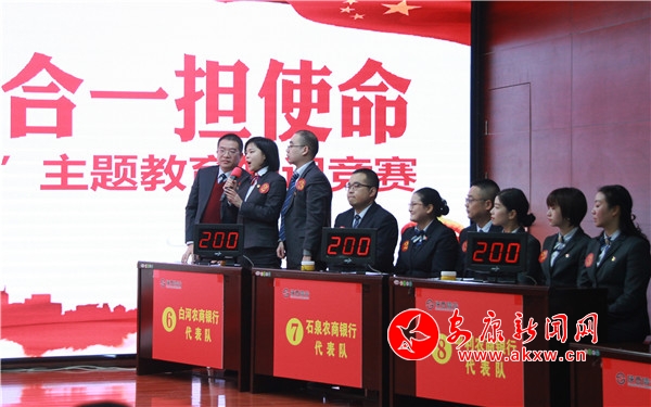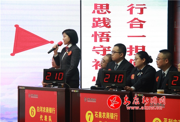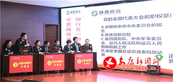 據(jù)了解,本次活動(dòng)以“學(xué)思踐悟守初心,知行合一擔(dān)使命”為主題,以習(xí)近平新時(shí)代中國特色社會(huì)主義思想、黨的十九屆四中全會(huì)精神、黨章黨規(guī)、掃黑除惡專項(xiàng)斗爭應(yīng)知應(yīng)會(huì)知識(shí)等為競(jìng)賽內(nèi)容,設(shè)置必答、搶答、風(fēng)險(xiǎn)、加試等環(huán)節(jié)進(jìn)行,來自安康各縣區(qū)農(nóng)商行10個(gè)代表隊(duì),共30名選手參與競(jìng)答。賽場(chǎng)上,氛圍緊張激烈,你追我趕,尤其在搶答題環(huán)節(jié),搶答令一經(jīng)發(fā)出,各隊(duì)選手立即開始爭相搶拍競(jìng)答器,比分稍微落后的隊(duì)伍在搶到答題權(quán)后,出色作答后贏得現(xiàn)場(chǎng)陣陣掌聲,即使答錯(cuò),選手們也毫不氣餒,互相鼓勵(lì),立即調(diào)整狀態(tài)準(zhǔn)備下一次搶答。比賽現(xiàn)場(chǎng)精彩紛呈,觀眾不時(shí)為選手們精準(zhǔn)的回答報(bào)以熱烈的掌聲。