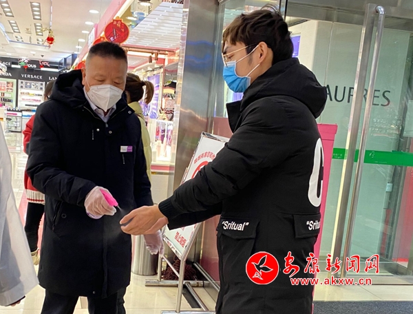 記者來到位于金州南路的時代購物廣場,觀察到店門口設有專門的測溫點,每個前來的顧客都需要先進行體溫測量,然后由工作人員對顧客的手部進行消毒,盡量保證顧客在選購貨品的時候不會產生交叉感染。同時,地上鋪有消毒地墊,每個顧客都需要踏上去對鞋底就行消毒。2Qu安康新聞網