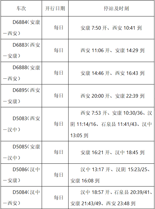 據悉,10月1日,首次加開安康至榆林城際列車1列;9月28日至10月8日,安康—西安間,每日加開“復興號”動集動車組1對,普速列車1對;9月30日至10月8日,安康—西安間,每日加開普速列車1對。