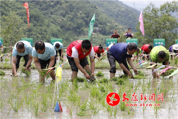 腳下泥花起,低頭插秧忙。在插秧比賽環節,只見稻田里,參賽選手紛紛拿出看家本領,赤腳擼袖、埋頭彎腰,左手握秧苗,右手飛快地進行分苗、插秧;田埂上,圍觀群眾的歌聲、加油聲連綿起伏,好一派熱火朝天的壯觀景象。