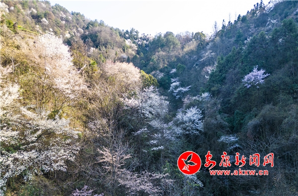 本網訊(記者 李俊 實習記者 卜昊天)近日,漢濱區晏壩鎮漫山的野生櫻桃花在和煦的春風中競相盛開。遠眺山林,從山腳到山頂次第綻放,山澗幽谷處處粉白,民居藏于其中,宛若世外桃源,起伏的山脈被一簇簇壓滿整個枝頭的櫻桃花所覆蓋。