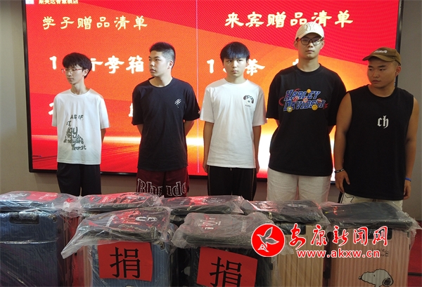 此次捐贈活動由漢濱區關廟鎮轄區斯美達智慧酒店發起,長安銀行漢濱支行、安康金鑫新能源有限公司、安康龍王泉有限公司等企業共同出資,捐贈行李箱、書包、水杯等物品價值合計約6萬余元。