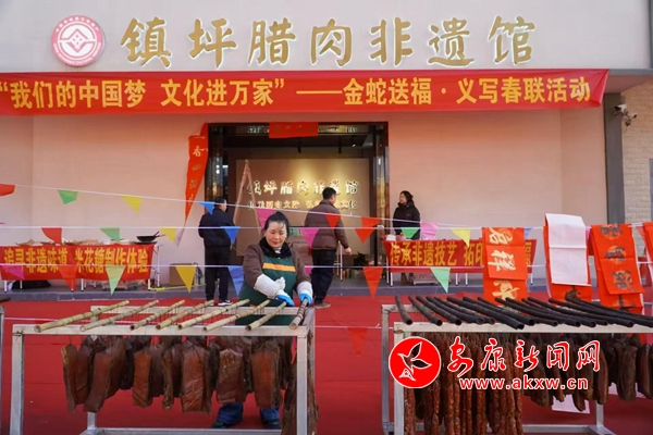“喝口臘肉湯,給個(gè)皇帝都不當(dāng)!”臘肉節(jié)準(zhǔn)備了20個(gè)大吊鍋,把大鐵鍋燉的各種臘肉和各種炒菜美食擺成長桌宴,讓到場的嘉賓和群眾共同品嘗。鎮(zhèn)坪臘肉節(jié)不僅僅是一場臘肉美食的集會,更是一種非遺技藝的傳承;顒蝇F(xiàn)場還邀請了陜南民歌傳唱人夏梅子為大家獻(xiàn)唱民歌,并舉辦了“追尋非遺味道”米花糖制作體驗(yàn)活動和“傳承非遺技藝”拓印美好祝福活動,以及“金蛇送福 文化進(jìn)萬家”義寫春聯(lián)等活動。