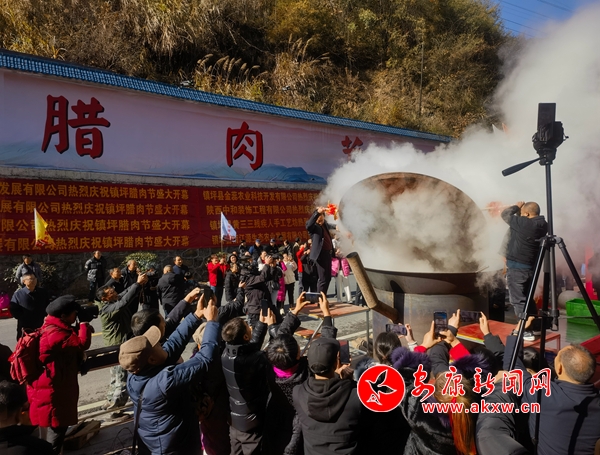 本網(wǎng)訊(記者 張喬) 灌香腸、熏臘肉,拓祝福、寫春聯(lián)……1月5日,“鎮(zhèn)坪縣臘肉節(jié)”拉開帷幕,一大早,陜西省省級非物質(zhì)文化遺產(chǎn)生產(chǎn)性保護(hù)示范基地“鎮(zhèn)坪臘肉腌制技藝”非遺工坊——鎮(zhèn)坪縣漢巴食品有限公司門前支起了巨型大鐵鍋,燉上了500斤的臘肉、臘排、臘豬蹄和香菇、竹筍、干洋芋等輔料。