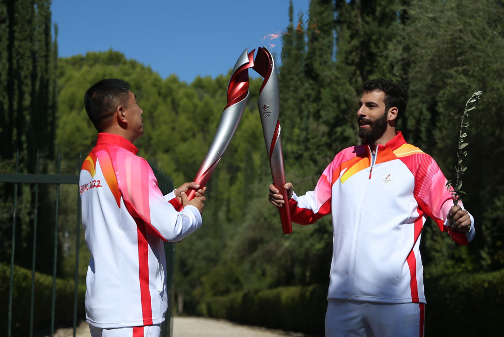 10月18日,希臘高山滑雪運動員揚尼斯·安東尼烏(右)將火種傳遞給第二名火炬手——前中國短道速滑運動員李佳軍。新華社記者 鄭煥松 攝P8K安康新聞網
